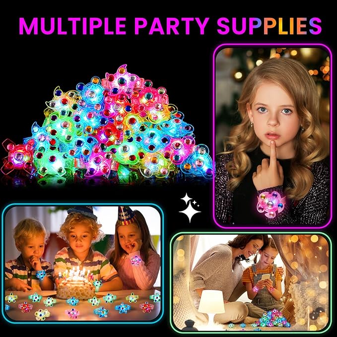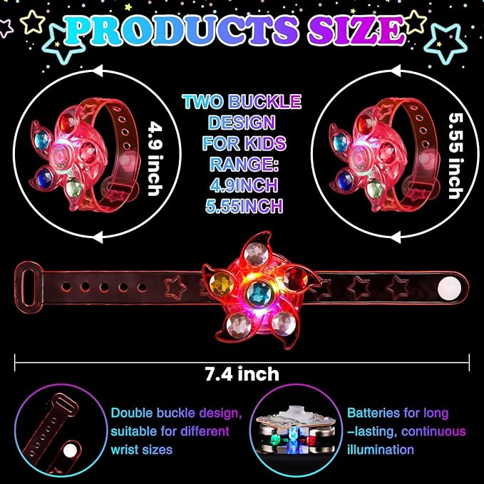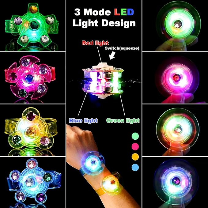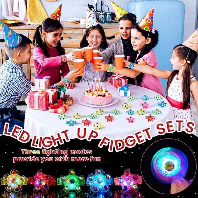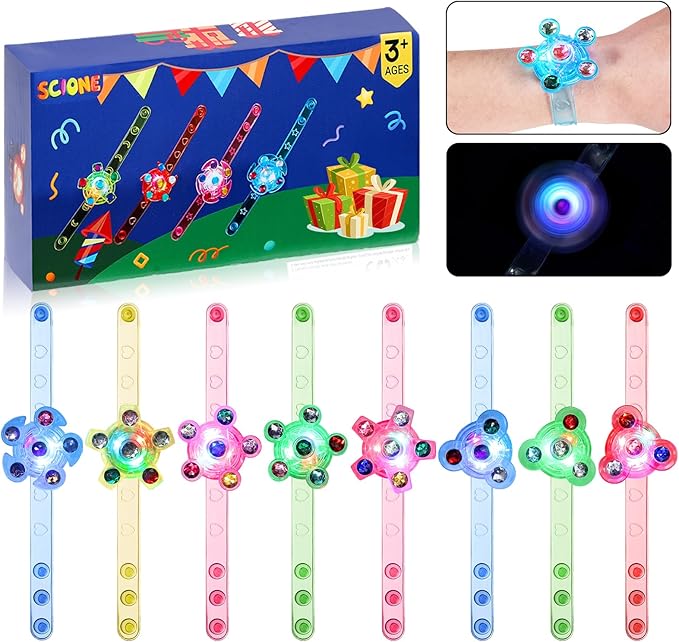 - GOODIE BAG STUFFERS:These birthday party favors for kids comes with 8 pcs led light up bracelets, It is a combination of bracelet, led lights and fidget spinner toy. Great party gifts for kids.
