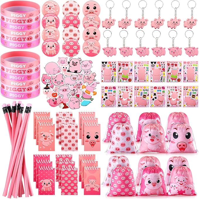 - Pig Party Favors: indulge in the charm of pink with our comprehensive package, curated to bring alive the farm charm in your party setting; The package consists of a set of pig themed party supplies including 12 pink pig drawstring backpacks, 12 silicone bracelets, 12 badges, 12 keychains, 12 pencils, 18 spiral notepads, 12 stickers and 50 sheets of DIY pig stickers; All of this is to make the pink farm birthday decorations engender an atmosphere of fun filled joy and excitement