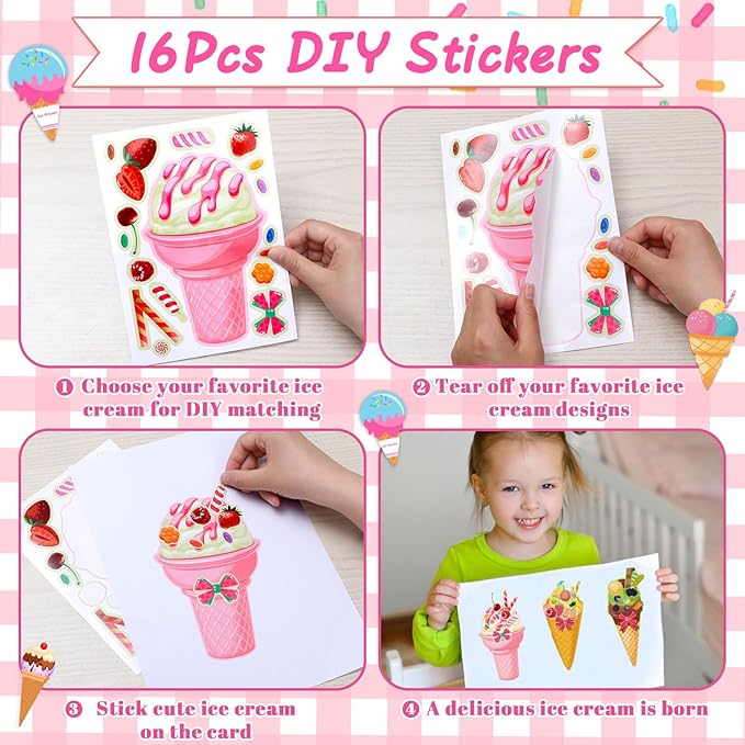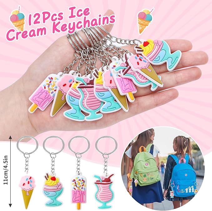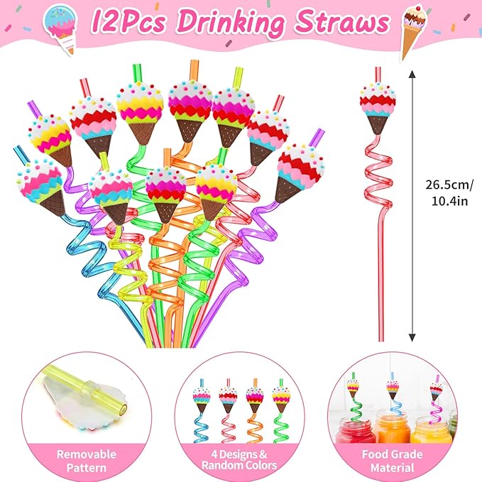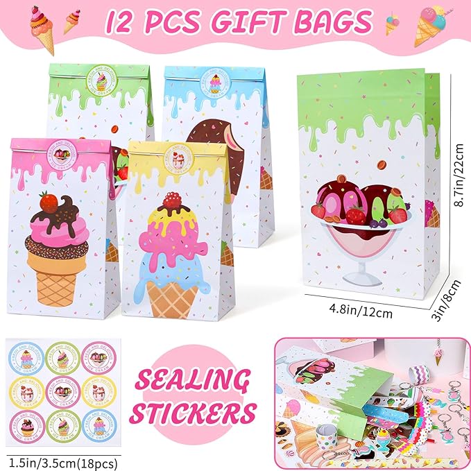- Pastel Ice Cream Party Favors: Ice cream symbolizes sweetness and happiness, and children will be happy to receive such party favors. We have carefully prepared 12 drinking straws (random colors), 12 paper bags (with sealing stickers), 16 DIY stickers, 12 ice cream keychains, and 12 slap bracelets. Our kit can help you host an ice cream party for 12 kids