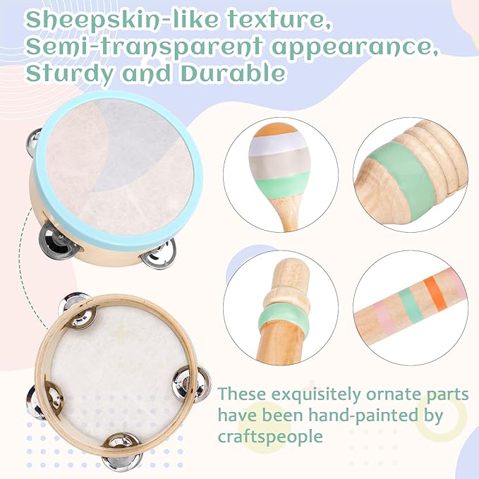- ✨【Exquisite Craftsmanship】The drum surface of the tambourine is crafted from imitation sheepskin, offering a semi-transparent appearance and a realistic texture, ensuring durability and resilience. The clarinet, wood sounder, hand bell, and two maracas are adorned with intricate hand-painted designs. This meticulous hand-painting process not only requires considerable time and effort but also results in stunning, individualized pieces, each displaying unique beauty and charm.