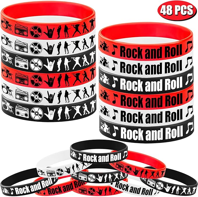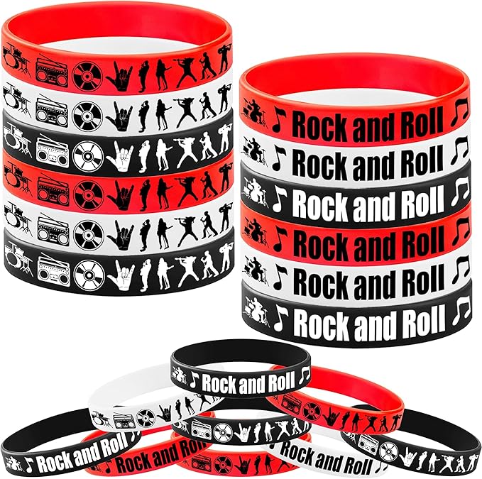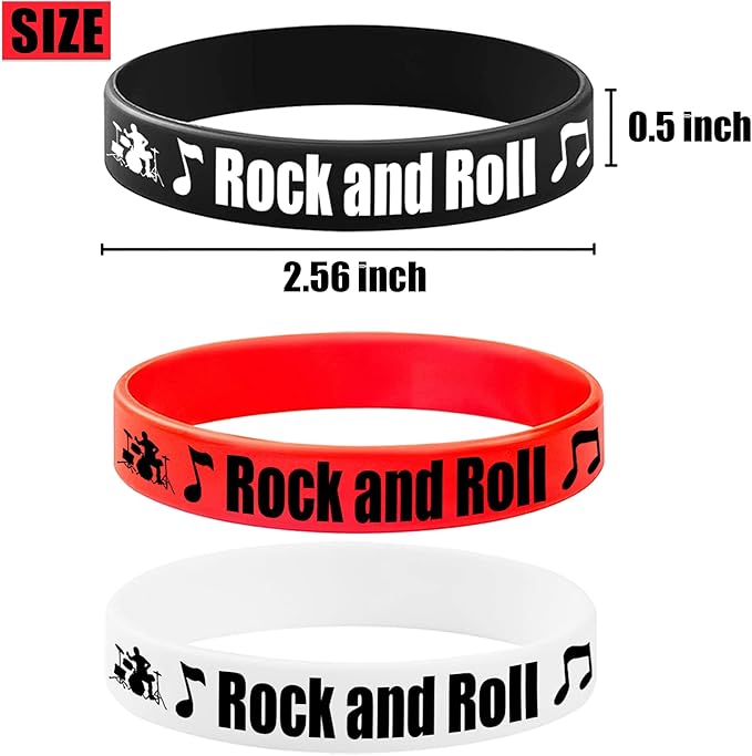 - Rock and roll Silicone Bracelets Set:48 pieces of rock and roll themed rubber bracelets with 3 different colors, black, red and white.