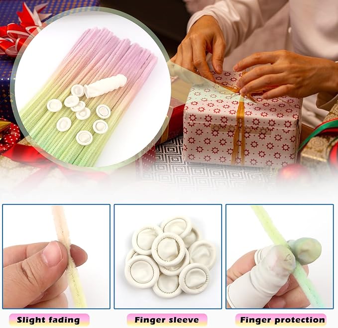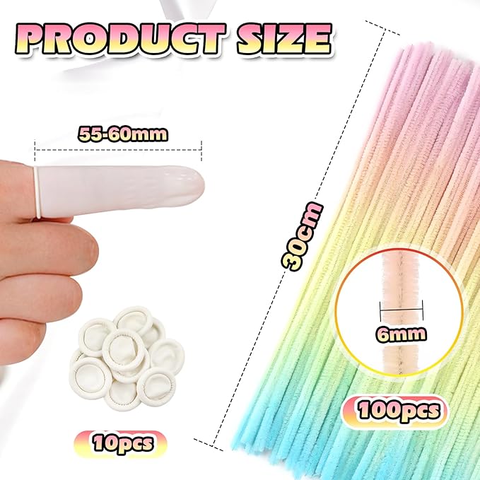- Size: 100pcs colored pipe cleaners 0.24 X12 inch (6 mm x300 mm); 10pcs white disposable latex finger covers 55-60 mm