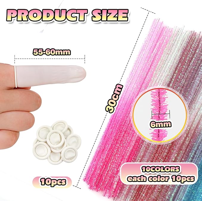 - Size: 100pcs 10 colors glitter pipe cleaners 0.24 X12 inch (6 mm x300 mm); 10pcs white disposable latex finger covers 55-60 mm
