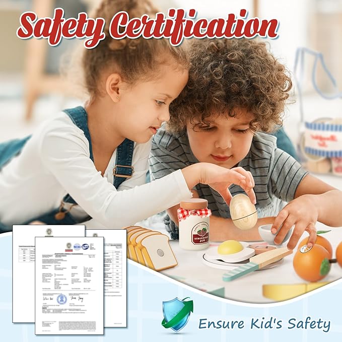 - CERTIFIED SAFE WOODEN FOOD TOYS: We prioritize your child's safety, so our toddler pretend foodset is crafted from sturdy natural wood, non-toxic paints and polished smooth edges to ensure safe and long-lasting pretend play time