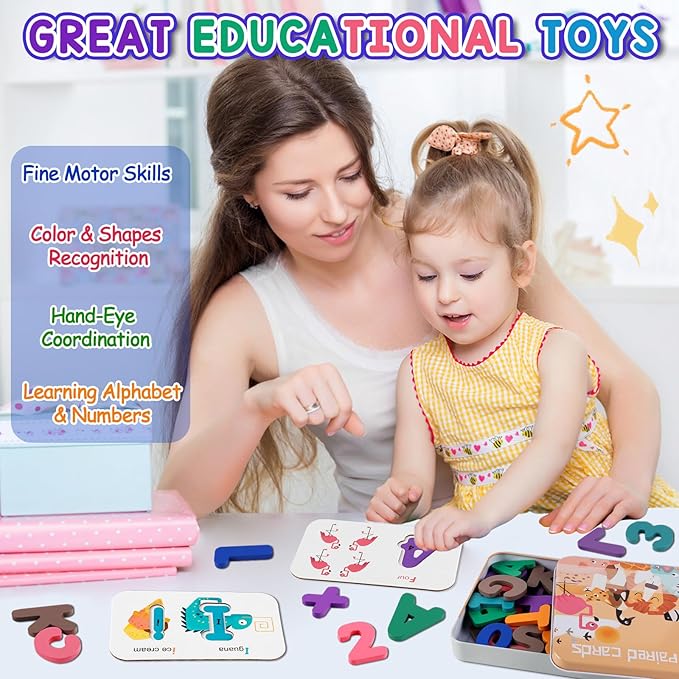 - Great Montessori Toys for Toddlers:We all know that learning is more effective when it's also fun! Kids will love sorting the wooden blocks and matching them to the cards! ABC flash cards can not only help kids learn alphabet and numbers easily through playing this flash cards set, but also can develop hand-eye coordination, colors & shapes recognition and fine motor skills. These montessori letters abc learning toys for kids ages 3-5