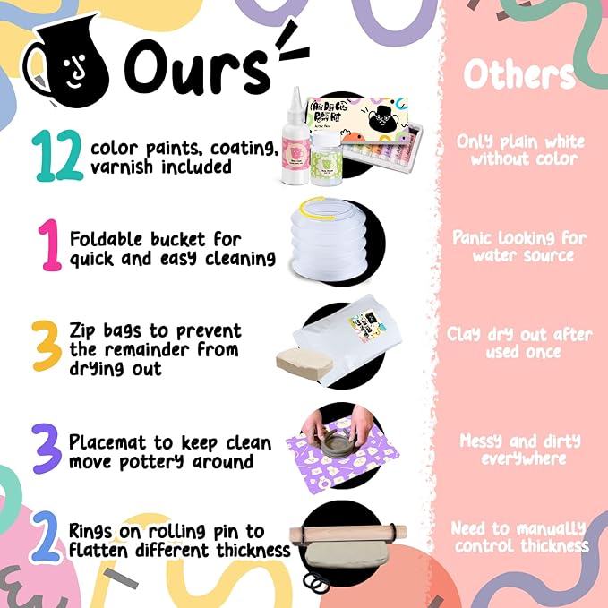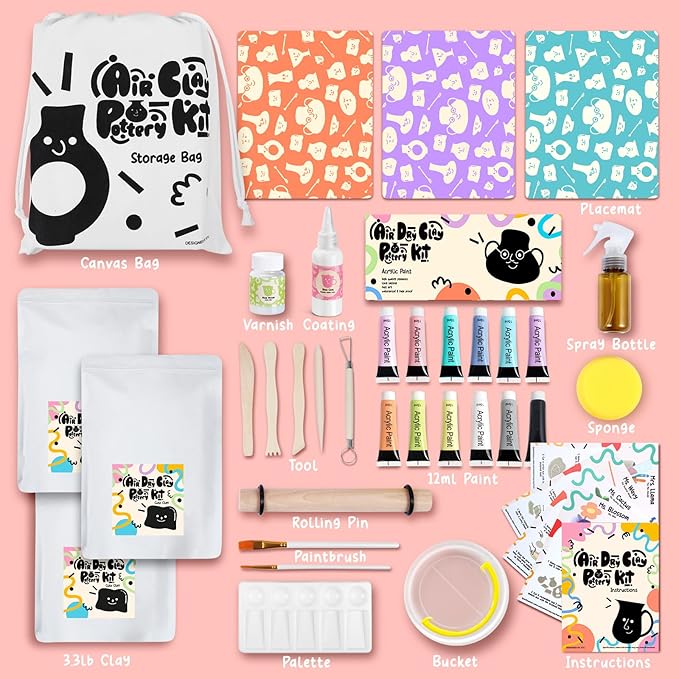 - ⚱️ALL-IN-ONE POTTERY SET | The air dry clay pottery kit for adults is designed with every tool, paint, varnish and more that you would need for your at-home pottery experience. From the 3.3lb of clay that's enough to make 4-6 potteries, distinct tools to 12 different pastel color paints, it is a perfect clay making kit for beginners.