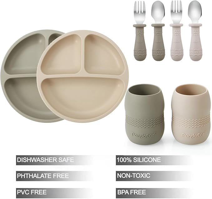 PandaEar Silicone Baby Feeding Set| 2 Pack Silicone Divided Suction Plate and 2 Pack Tiny Cup with 2 Spoons 2 Forks| Baby Led Weaning Supplies Self Feeding Eating Utensils (Silverware Set)