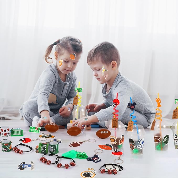 - Quality and Reliable Material: Football bracelets are made of quality materials, Football straws and whistles are made of ABS plastic, mini Football are made of PU materials, Football themed stickers are made of PVC; The cup is made of quality PP material, and the thank you tag is made of Kraft paper, which is reliable and safe to use, not easy to fade or break, reusable and sturdy.