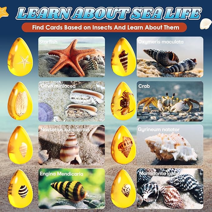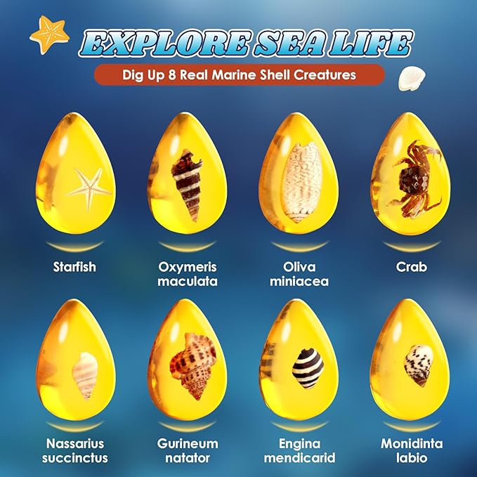 - 【 Learn While You Digging 】 Each amber houses a secret of the deep, and with eight informative cards, kids can embark on a journey of learning about the fascinating world of sea life. This process of digging up sharpens hand-eye coordination and ignites the explorer's imagination.