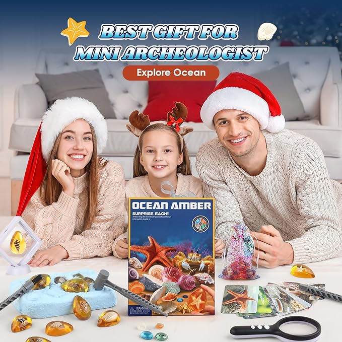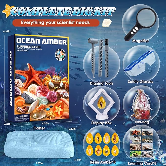 - 【 Embark on an Undersea Adventure 】 Become an ocean explorer with this captivating ocean amber dig kit. Unearth eight detailed ocean creature ambers and four dazzling gemstones from the digging toys for age 5-7 6-8. It's the perfect start for young adventurers to discover the treasures hidden beneath the waves.