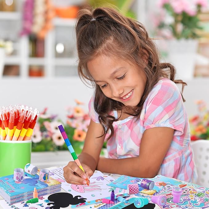 - Suitable Size: mermaid coloring book for kids about 6.7 x 4.7 inch, crayons about 7 inch, slap bracelets about 8.7 x 1.2 inch, stampers about 1.38 inch, make-a-face stickers about 6.7 x 4.3 inch, color scratch about 5.1 inch, stickers about 4.7 x 2.7 inch, little mermaid party favor set fit in most birthday baby shower party goodie bags.