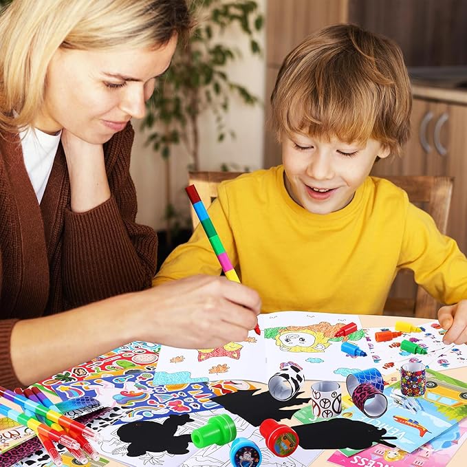 - Suitable Size: coloring book for kids about 6.7 x 4.7 inch, crayons about 7 inch, slap bracelets about 8.7 x 1.2 inch, stampers about 1.38 inch, make-a-face stickers about 6.7 x 4.3 inch, color scratch about 5.1 inch, stickers about 4.7 x 2.7 inch, party favor set fit in most birthday party goodie bags.