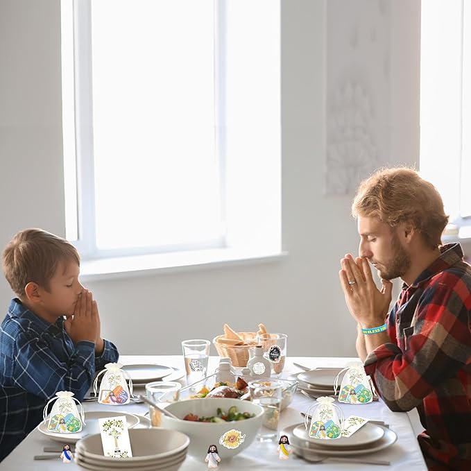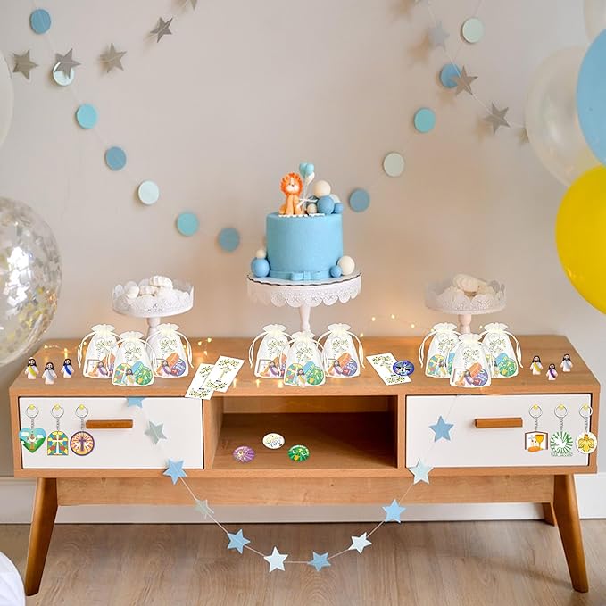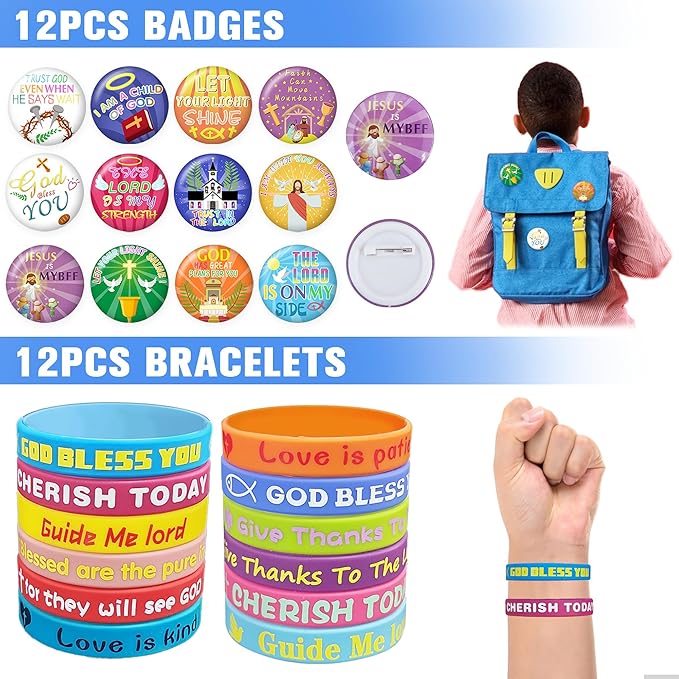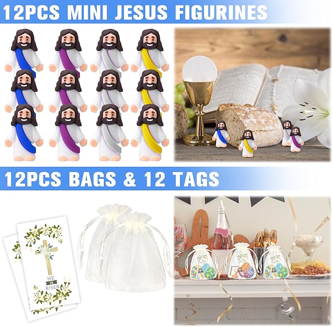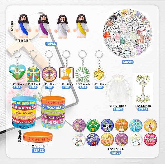 - Package quantity: 12 x mini Jesus figurines, 12 x button pins, 12 x key chains, 12 x rubber bracelets, 50 x stickers, 12 x organza bags, 12 x cards. Perfect for bible party, the best goodie bags for family and friends.