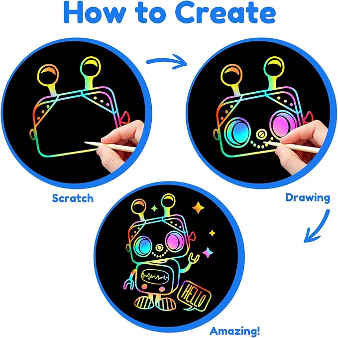 - Arts And Crafts Supplies - Just scratch off the black coating on the drawing paper, and rainbow lines will appear. Children can also use the stencils to design more cute and funny shapes on the scraped paper to create colorful craft paper artworks. Best birthday party crafts for kids.The scratch paper art supplies for kids 3-5.