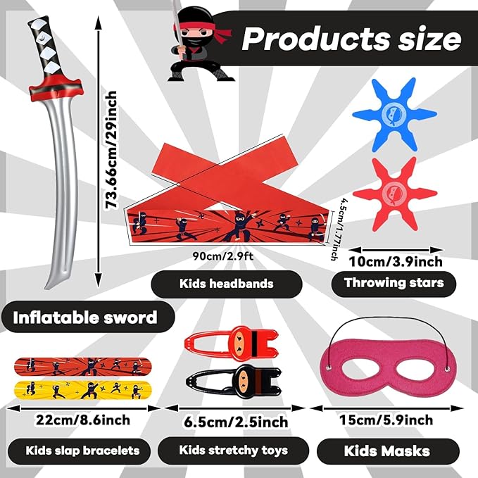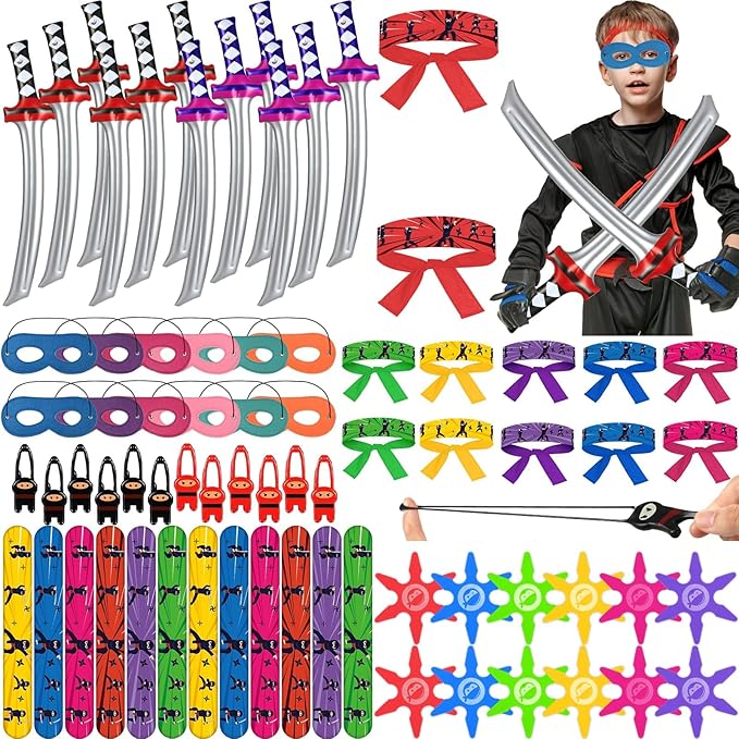 - Package includes: You will get 72pcs colorful karate party favors, including 12pcs inflatable karate PVC swords, measuring about 30 x 6 inches, proper size for you to hold, 12pcs karate headbands, measuring about 35.4 x 1.77 inches, suitable for most people, 12pcs karate slap bracelets, 12pcs foam throwing stars, 12pcs karate stretchy flying toys, 12pcs masks. The abundant kits and rich styles will satisfy your various needs and replacements.