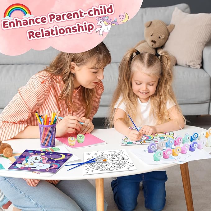 - All-inclusive Unicorn Paint by Numbers Kit :To create authentic works of art, includes 6 canvas (7.87” x 7.87”), 48 acrylic paints, 2 glow-in-the-dark paints, 12 brushes (Different Nibs), 2 wooden easels, 6 adhesive hooks,6 Hangers, 12 guide cards of the final image (Day and Night). Let your child's creativity flourish as they indulge in a seamless crafting experience, painting exquisite unicorn artworks