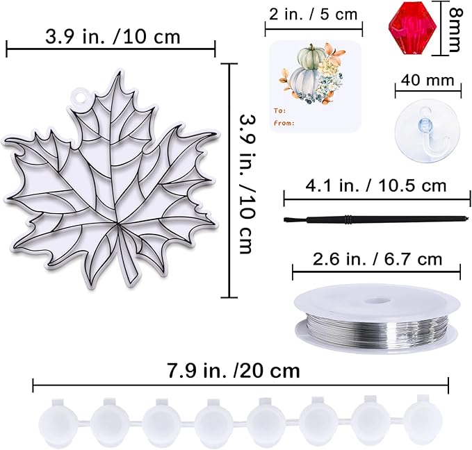 - Size: These transparent fall leaf suncatchers are about 4" in diameter. Each bottle of suncatcher paint holds 0.2 fl oz (6ml), and each mini empty paint pot holds 0.06 fl oz (2ml). The acrylic beads measure about 0.3" in diameter, and the fishing thread is approximately 393.7" long. Each suction hook is about 2.4" in diameter. The sizes are perfect for little hands! Once completed, the autumn window hanging suncatcher ornaments are perfect for glass windows, doors, porches, or gardens.