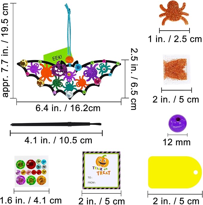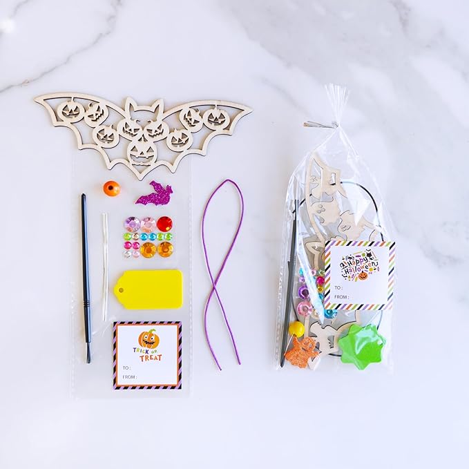 • Halloween Crafts Bat Crafts Kit: Dive into Halloween crafting with everything you need to create 24 Halloween wooden bat ornament. The set includes 24 unfinished wooden bat cutouts, 2 sets of acrylic paints, 24 brushes, 1 palette, 7 colors of glitter, 24 glittery foam stickers with Halloween themes, 24 sheets of gem stickers, 24 cords, 24 wooden beads, 24 treat bags, 24 twist ties, and 24 gift tags. Perfect for Halloween parties, classroom activities, gift-giving, and school projects.