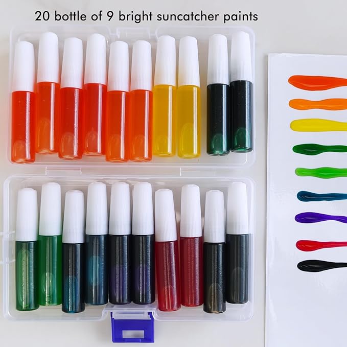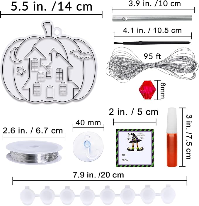 • Quantity: 24 sets Halloween Pumpkin Suncatcher Wind Chime Kits include 24 Halloween pumpkin suncatchers in 8 designs. 20 bottles of 9 Halloween color suncatcher paints (6ml per bottle), 1 strip of 8 empty paint pots, 24 paintbrushes, 288 acrylic beads, 72 wind chime tubes, 1 roll of silver metallic thread for hanging wind chimes, 1 roll of fishing thread, 24 suction hooks and 24 gift stickers. Each suncatcher has a hole at the top for hanging and 3 holes at the bottom for attaching wind chimes.