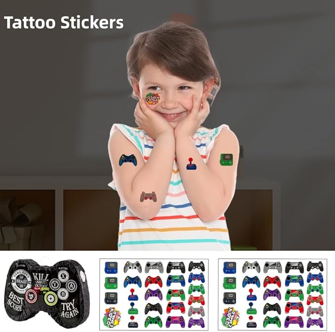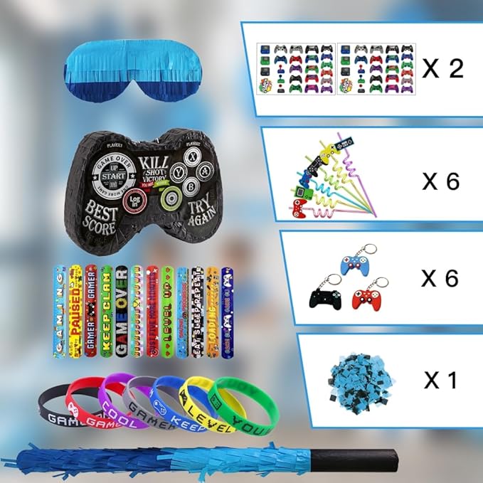 - VIDEO GAME PARTY FAVORS SUPPLIES: We offer 1 video game pinata, 6 game controller straws,6 rubber bracelets, game controller keychains (3 types), 2 sheet luminous tattoo stickers and 12 slap bracelets. This is a very interesting and rich set of game party favors, how can gamers not fall in love with it? It's sure to be a hit with the kids.
