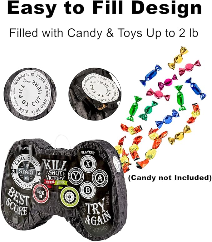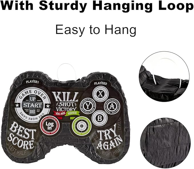 - EASY TO FILL: The video game controller pinata comes with a pre-made hole with an opening sticker on it which tells where to fill and a sturdy hanging loop at the top for hanging. Except candies, chocolates, mini toys, you can fill anything you want through the hole easily.