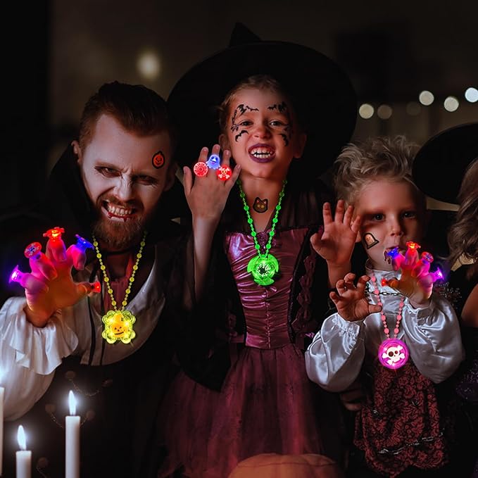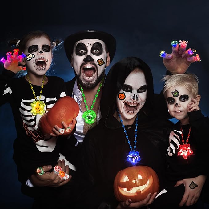 - [ Halloween Light Up Toys ] These light up Halloween toys are perfect. 10 LED Light Up Spinning Necklaces, 40 flash LED rings, 48 Halloween temporary tattoos. totally in 100 pcs. The style may be a little different. Enough quantities and styles for family or friends gathering
