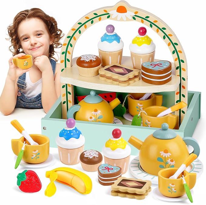 - Durable Tea Party Set Toys: All tea sets and desserts toys are made of thick premium natural wood materials, which makes it very sturdy. Wooden tea party sets not as fragile as plastic tea set or as deformed easily as metal tea set. Means it will stand up well to toddlers brut force, smooth edges also protect soft hands of toddlers