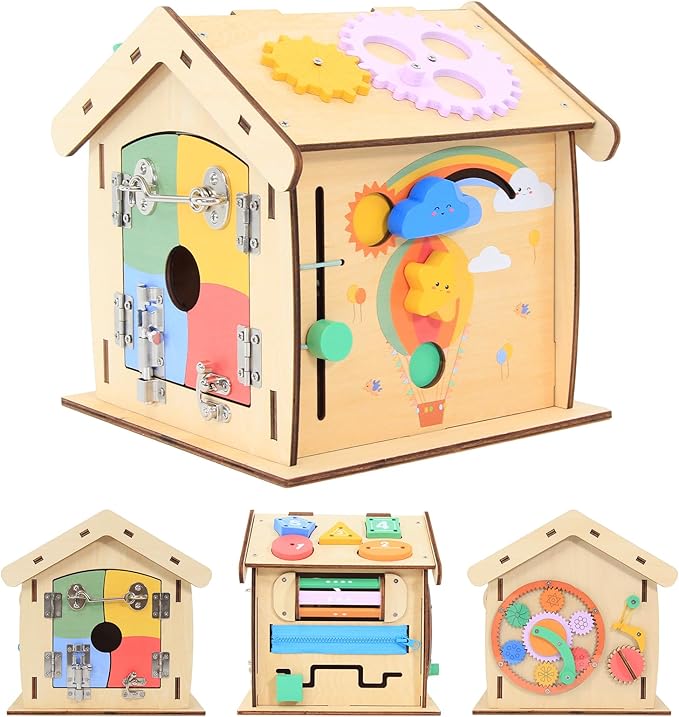 - INTERNAL STORAGE SPACE: montessori toys for 3 year old has plenty of storage space inside, baby can use it to store toys and develop the habit of organizing. Busy house, a sensory toys, Busy house is easy to assemble and convenient, the assembly takes 1-3 minutes, the assembly is completed to form a sufficient storage space.