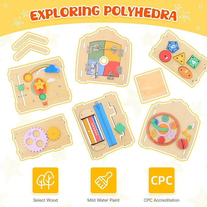 - PRODUCT MATERIAL: Specially selected baby busy board material, busy board for over 3 years old kids. made of high quality wood Busy Board, laser cut and hand polished, smooth rounded edges without burrs, will not hurt the baby. The size of each accessory is suitable for baby's grip, no need to worry about baby swallowing, fully protect the safety of young children.