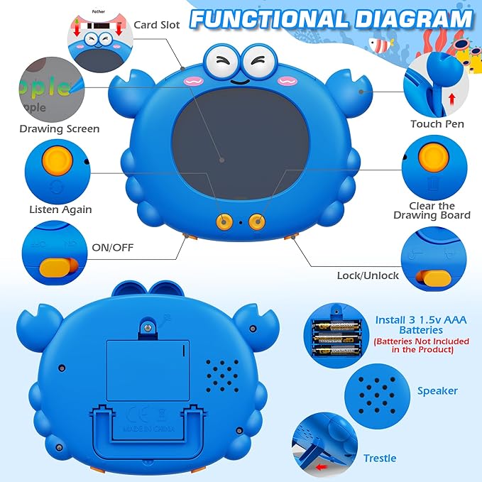 - Easy to use:Just turn it on, insert the card, and it will read aloud. The unique one-button cycle function allows for repeated listening without reinserting the card. Plus, the crab's pincers can be detached and used as a pen for writing letters, drawing, and other activities, making learning fun and interactive for children. Perfect for daily use at home or in educational settings.