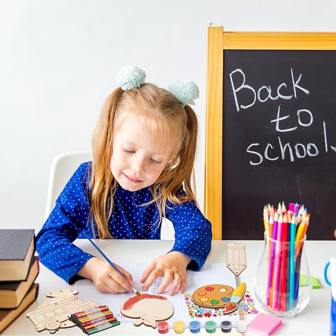 - Back to School Craft Kit for Kids :The DIY wooden wind chimes kit for kids include 9 x unfinished wooden school elements cutouts,27x wind chime tubes(3 colors, 9 for each color),2x paiting brushes,1x paint(6 colors),9x 1M silver wire,9 x color rope,1x rhinestone sticker.Sufficient quantity and various styles to meet your decorative needs,kids can make their own apple wind chime kit to celebrating First Day of School.