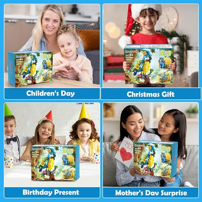- 3-in-1 Animal Building Block Kit--The INSOON 3 in 1 flower animal building set invites you into a vibrant world of creativity and imagination! This set features three charming animal designs: an elegant parrot, a beautiful butterfly, and an adorable kitten. Kids can freely assemble these lively characters and weave endless fun stories, enjoying the joy of creation