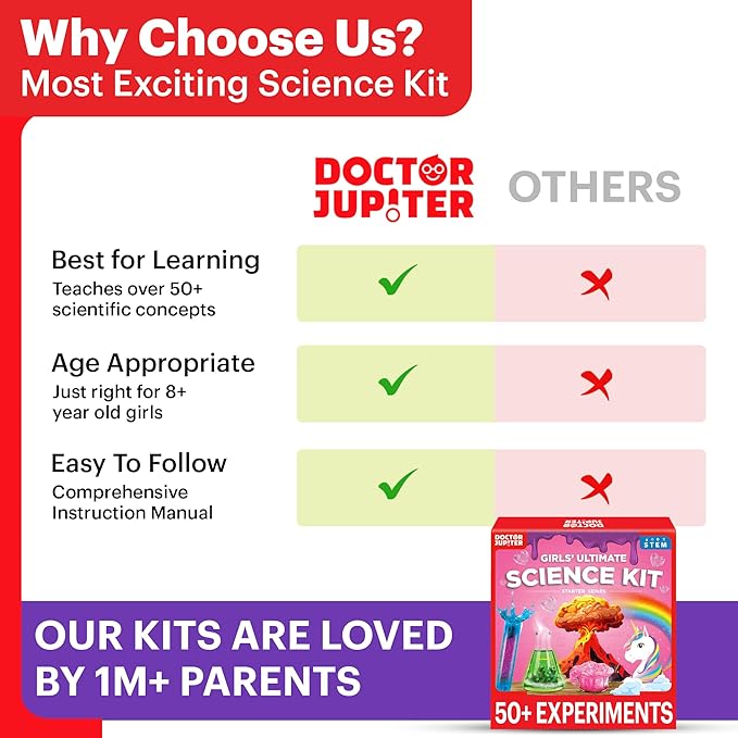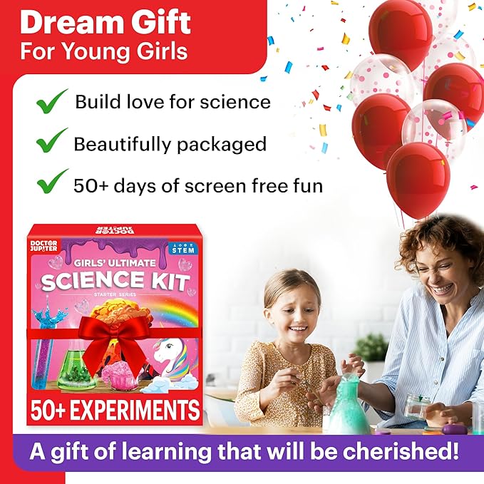 - ✅ A SPECIAL SCIENCE KIT FOR GIRLS: Spark a love for science in girls with the Doctor Jupiter Girls' Ultimate Science Kit, featuring 50+ exciting experiments designed just for them. From dazzling rainbow crystals and color changing volcanoes to lava lamps, unicorn bath bombs and fluffy slimes, each experiment comes with easy-to-follow instructions that makes learning fun and exiciting.