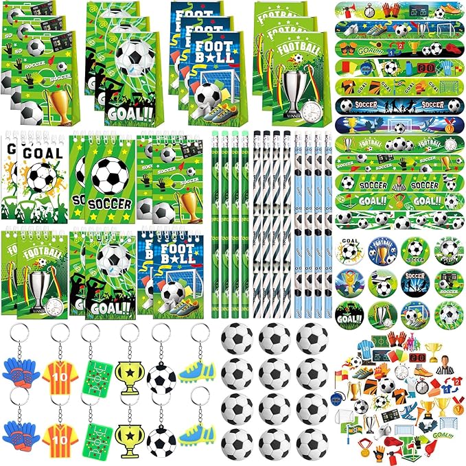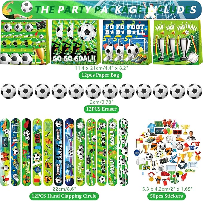 - You Will Get: You will get a total of 133 pieces of soccer birthday party favors, 12PCS soccer Bracelets Wristbands, 50PCS soccer Stickers, 12PCS soccer favor bags, 12PCS soccer Notepads, 12PCS soccer button pins, 12PCS soccer keychains, 12PCS soccer pencils, 12PCS soccer erasers, enough quantity, and cool styles can meet your needs for various kinds of soccer party supplies