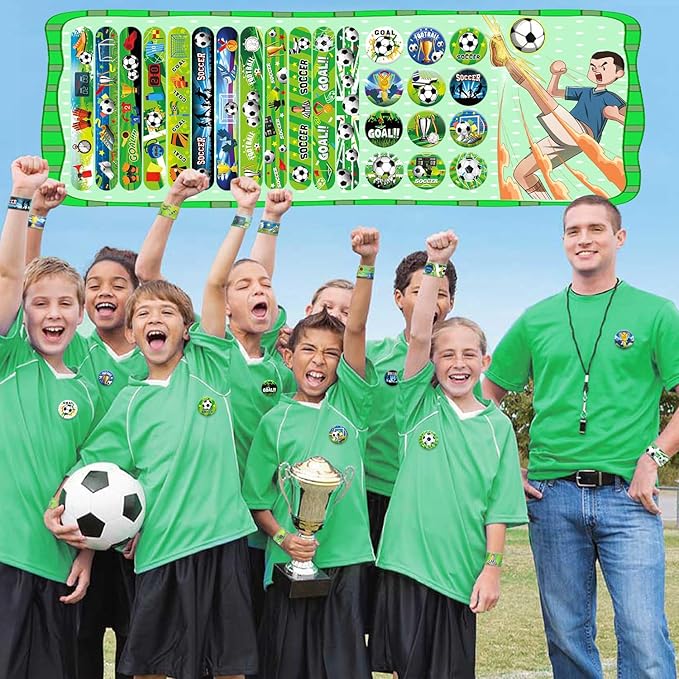 - Reliable Material: The soccer theme goody bags, soccer stickers, and soccer mini notepad are made of heavy recyclable paper cards. the soccer button badges are made of alloy, and soccer slap bracelets are mainly made of durable metal cores on the inside & tightly wrapped with soft material on the outside.