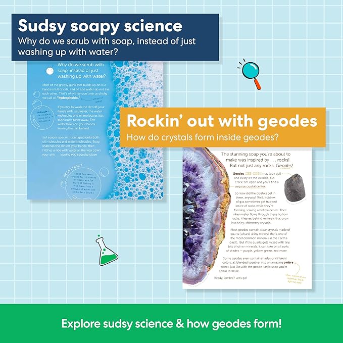 - EDUCATIONAL: Explore colorful ombre geodes and the squeaky-clean reactions between soap, grime, and water.