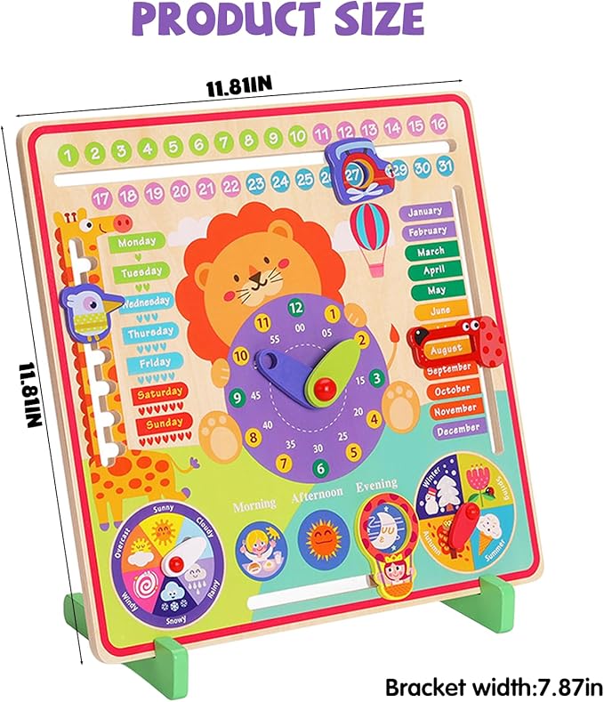 - ⏰【Wooden Calendar Board for Kids】: Kids can learn time, days of the week, dates, months of the year, weather and seasons by moving the sliders on the busy board to record their daily life. The clock for kids to learn time and understand the importance of punctuality-Better arrange a healthy daily routine.