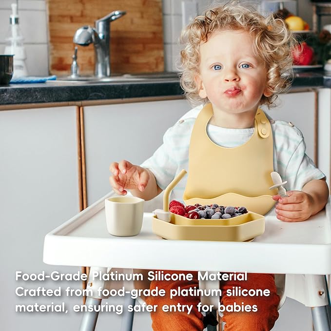 - 【All-in-One Feeding Set】This 8-piece silicone baby feeding set is a total package. Got a divided suction plate, suction bowl, drinking cup with clip-on straw, 3 silicone feeder spoons, and a bib. Saves you the hassle of hunting for separate items and streamlines mealtime prep.