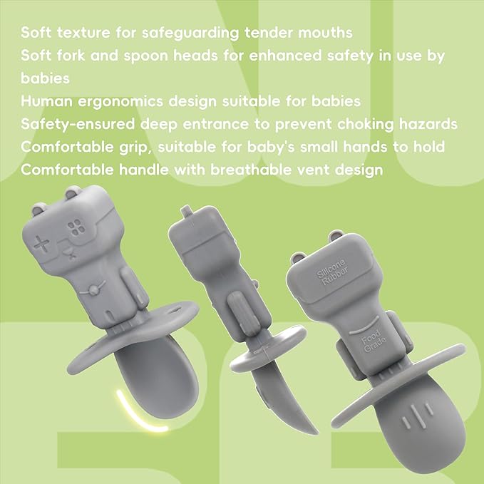 - 【Protective Barrier Design】: The robot silicone self-feeding baby spoons are designed with babies in mind. The baffle limiter can provide extra safety and prevent choking. This baby utensil set is not only suitable for baby to eat, but also prevents the baby from potential harm.