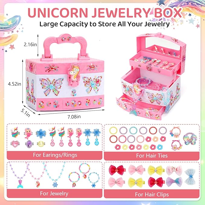 - EASY TO USE JEWELRY BOX: The girl toys come in a very cute pink box for long-term storage and everyday use. It’s a great jewelry box organizer to put everything in, with a unicorn button to protect all the accessories