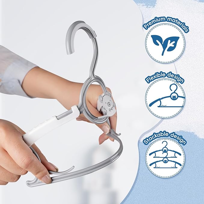 Baby Hangers 60 Pack Kids Hangers-Extendable Adjustable Non-Slip Plastic Kid Hangers for Closet,Stackable Baby Clothes Hangers for Toddler Kids Children Infant Teen,Grey Bear Toddler Hangers