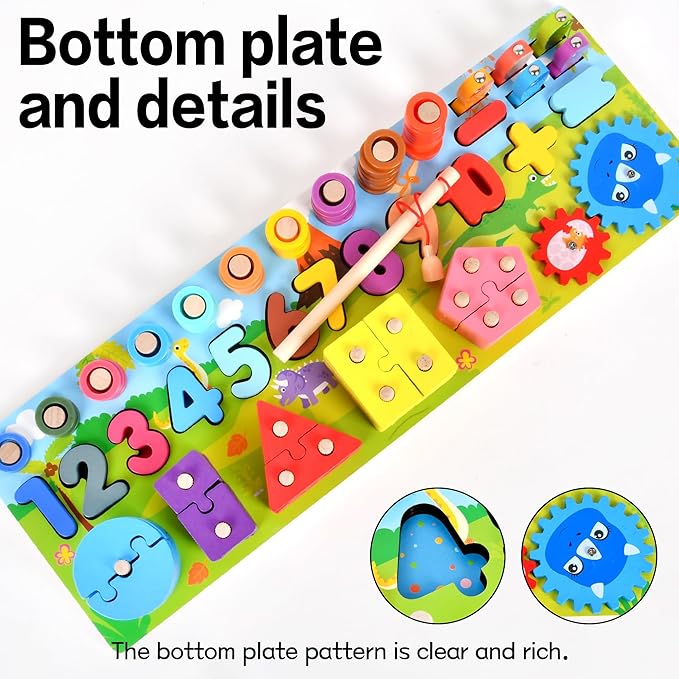- The multi-functional fishing class is made of natural wood and covered with non-toxic water-based paint. The smooth surface of the board has been carefully polished, and the large-sized figures are made for the safety of small researchers, are guaranteed safe toys and perfect puzzle toys for play and learning. Color pictures and the classification of inserted different colors and numbers help to distinguish colors, geometric shapes, and develop fine motor skills.