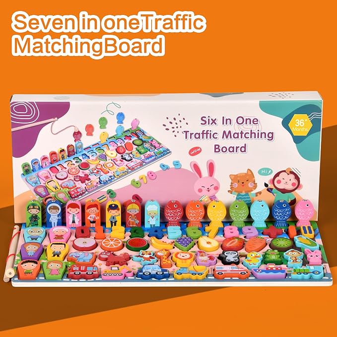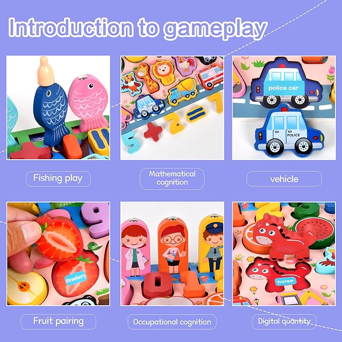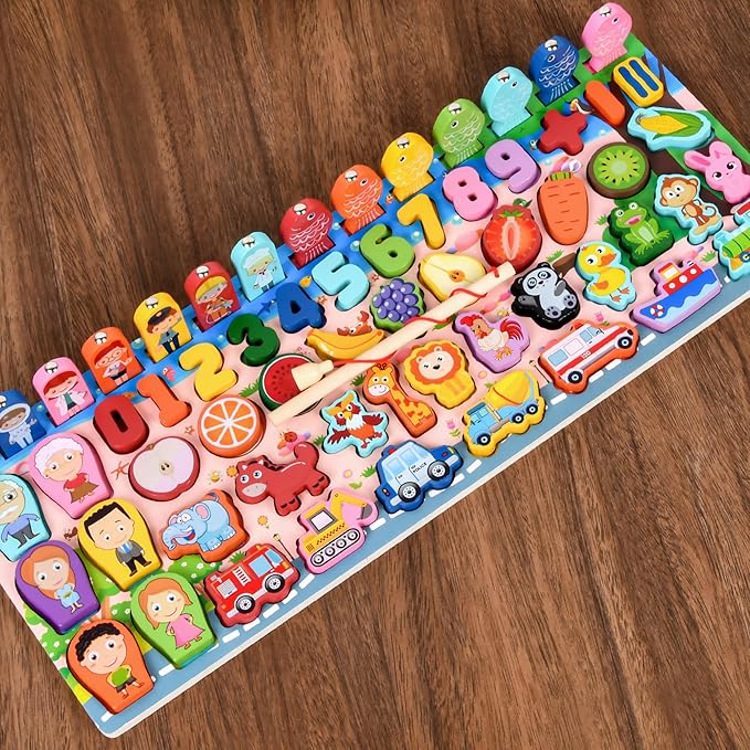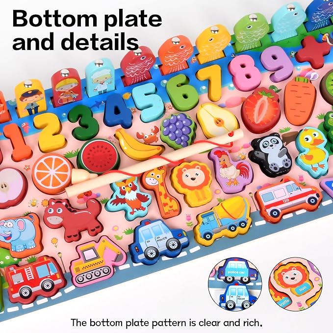 - This shape number fishing game board, which has interesting animals and animal images, colorful cars, small fruits, develops young children's color, shape, number recognition, hand-eye coordination, encourages creativity and imagination, fine motor skills, math counting skills, and is an ideal toy for young children's preschool learning.