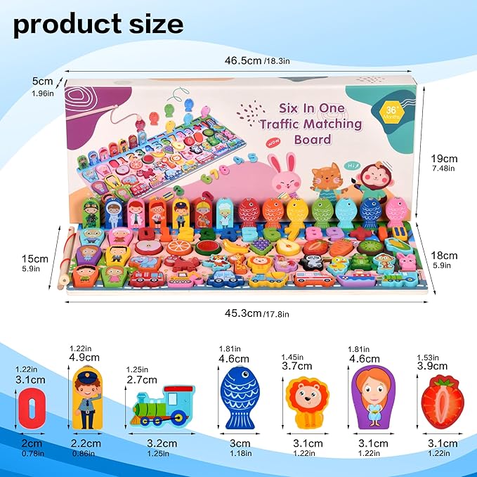 - The multi-functional fishing class is made of natural wood and covered with non-toxic water-based paint. The smooth surface of the board has been carefully polished, and the large-sized figures are made for the safety of small researchers, are guaranteed safe toys and perfect puzzle toys for play and learning. Color pictures and the classification of inserted different colors and numbers help to distinguish colors, geometric shapes, and develop fine motor skills.