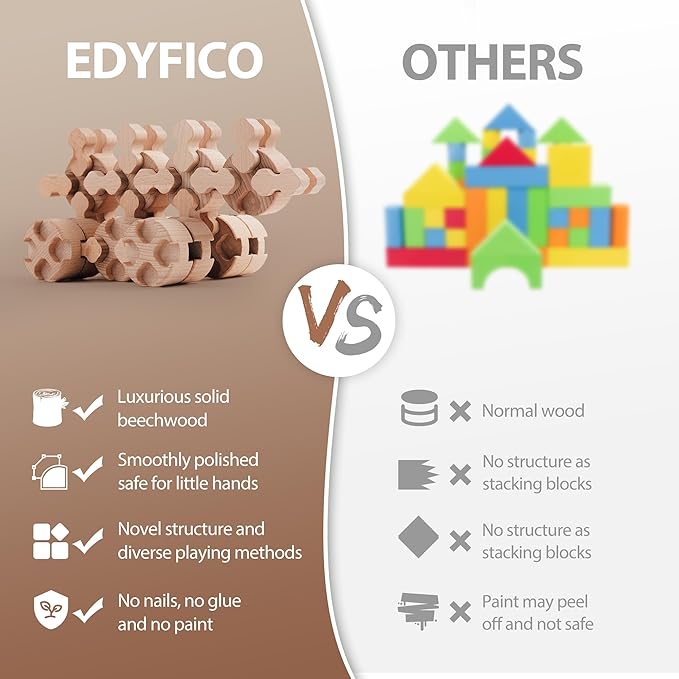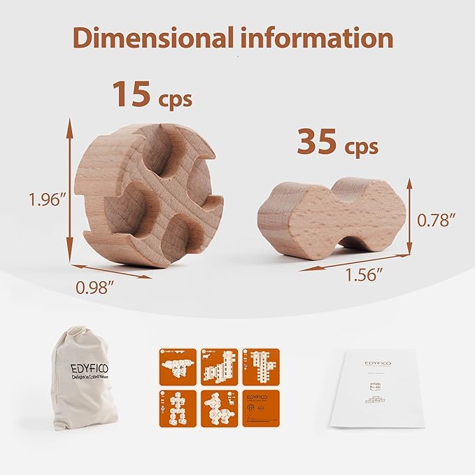 - WHAT YOU GET -The Edyfico STEM toys set includes 50 solid wooden pieces(15 large + 35 small), 4 interactive parent-child activity cards, 1 canvas storage bag, and 1 instruction manual. We welcome you back to Edyfico for more creative masterpieces and can't wait to see what you have to share!