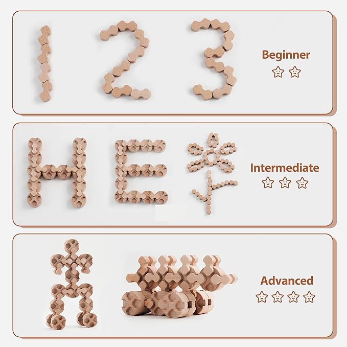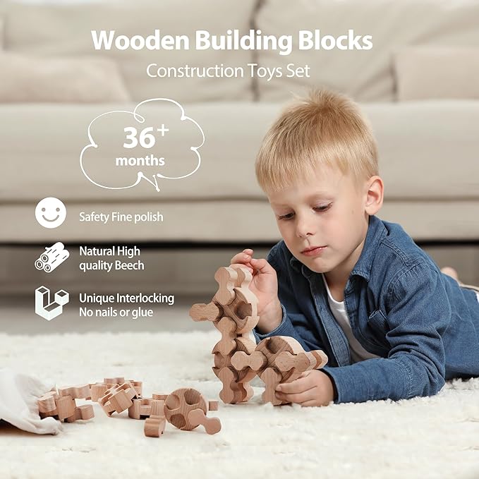 - PLASTIC-FREE & VERSATILE BUILDING SET -Tired of all those plastic toys? This wooden blocks set is a brilliant change and a fun alternative to other usual wooden building toys. With open-ended play and unique peanut-shape interlocking pieces, kids (and adults!) can build all sorts of amazing things without nails or glue. On a rainy day, the family can build amazing structures together, it's very fun to see your kids using their imagination to build different things