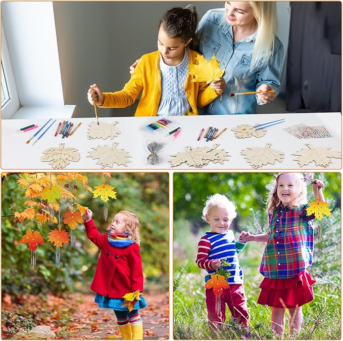 - Package includes: This fall leaves wind chime crafts kit for kids features 16 unfinished wooden fall leaves, 48 wind chime tubes, 2 painting brushes (paint not included), a box of 12 watercolor pens in assorted colors, a silver wire of 65.6ft/20m, and 2 water diamond stickers. With ample quantities and a variety of styles, it's ideal for children's creative activities, enabling them to craft their own unique fall maple leaves wind chime.