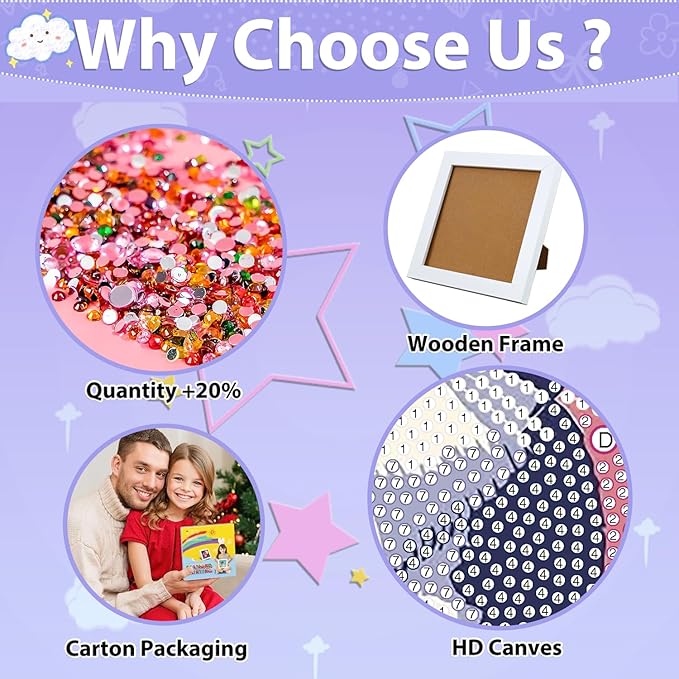 - Best Choice for Kids:Our kids Diamond Art Painting kits come with pre framed.The cute pictures and exquisite packaging are perfect for birthday and Christmas.You can put the finished product on the table or hang it on the wall at home,such as in the baby room,living room, etc.It will be a perfect home decoration full of success.