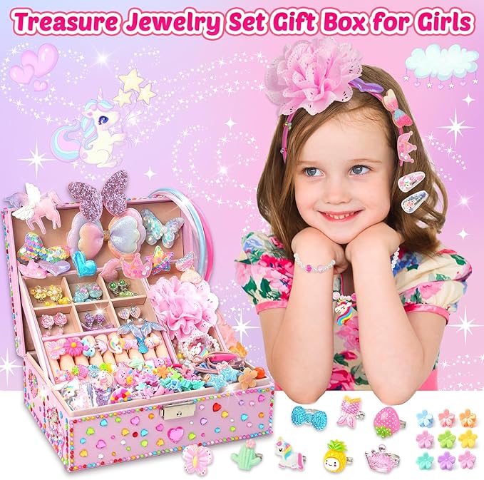 - 💝All-in-One Girls Toys: Our jewelry toys gifts set for girls is the most special and thoughtful girls birthday gifts Including 90+ dress up pecices in total: 1 PU leather unicorn jewelry box, 16 rings, 12 clip-on earrings, 14 hair ties, 3 Headbands and 13 headband DIY making kits, 20 small hair clips, 9 hairpins, 1 set of unicorn necklace and bracelet,1 mirror, 2 diamond stickers, 2 type of glues and 1 sparking packing box. Perfect girls toys age 6-8 4 year old girl valentines day gifts Easter birthday gifts arts crafts.