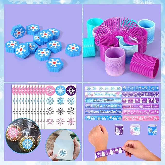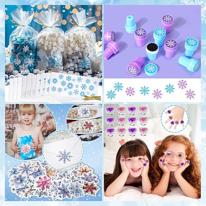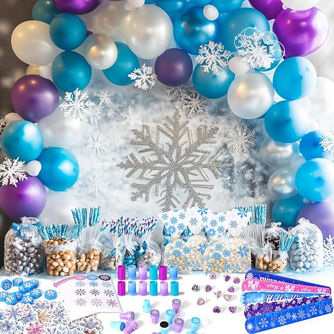 - DIVERSIFIED PARTY DECORATION ELEMENTS: Compared with other single decorations, this frozen birthday party decorations provides you with a variety of essential accessories for Frozen decorations, including rings, fun Slap Bracelets, spring toys, practical erasers, gift bags, snowflake stickers, etc., which you can mix and match as you like to create an unforgettable party experience in an all-around way! Create an unforgettable party experience for you!